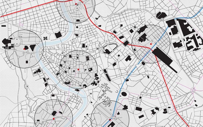 As a way of projecting the growing need for motorino and bicycle parking spaces in Rome into the future, several locations were identified which can serve as prime locations to connect commuters to others means of public transit. These identified zones occur at nodes in the city in which several transit services currently intersect. The nodes are as follows: A. Piazza del Popolo, B. Terminal Gianicolo, C. Piazza Bernardino da Feltre, D. Largo di Torre Argentina, E. Circo Massimo, and F. Termini.