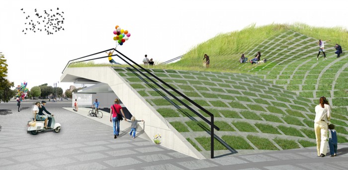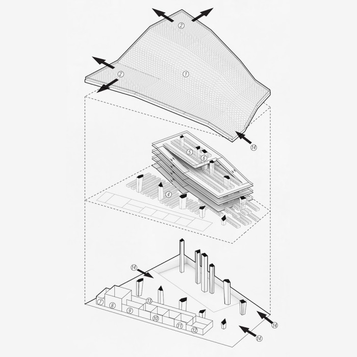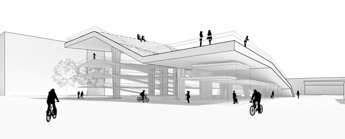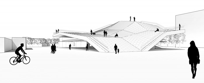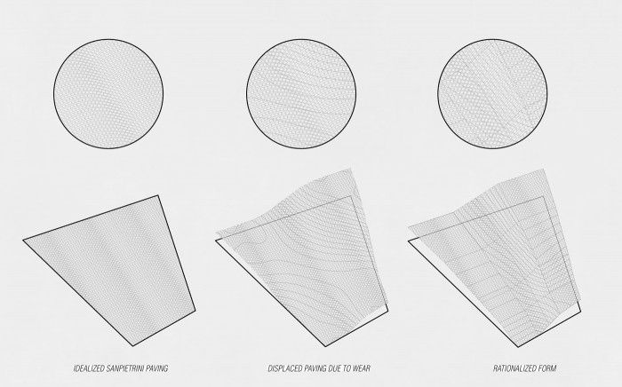 Open Terminal creates an activated parking destination for motorini and bicycles and places importance on public space while maintaining a sheltered zone for public transit commuters to store their units. This new node will serve as a portal allowing users to connect from different forms of transportation. The park atop the parking spaces is derived from Rome’s famous Sanpietrini paving and their presence throughout the city. As the paving ages and its substrate loosens it begins to heave and become displaced to form new topographies. In this park this unique shifting event is exaggerated and rationalized into planes to allow for comfortable and walkable surfaces. As Rome contemplates the gradual removal of the Sanpietrini (established by Pope Sixtus V in the 16th century) due in part to the above mentioned characterisic this proposal aims to preserve its memory. The walkable texture of the park is developed from the geometric arrangement of the Sanpietrini and is taken as a template in which local grasses can grow in the space once occupied by the individual stones.
