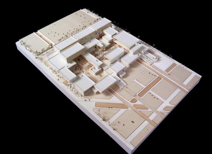 Model of building and fields (basswood, museum board)